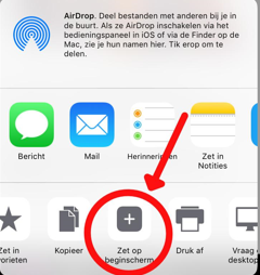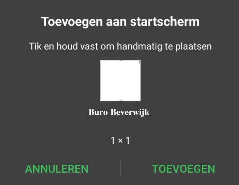Je komt dan in een menu terecht met tal van keuzes. Ieder 'merk' telefoon doet dat op zijn eigen manier. Maar er zal altijd wel ergens iets staan van 'Zet op beginscherm', 'Add to Home screen' of 'Toevoegen aan startscherm'